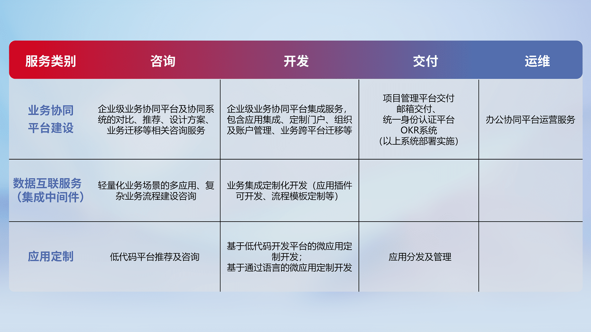 针对钉钉、、企微、、、IDaas等平台级产品提供产品的规划、、方案、、、交付、、定制化开发等服务,,,实现如统一协同办公、、、智能客户服务、、、、混合会议管理、、、、智能数据查询、、、等业务场景,,,,实现数字化转型。。