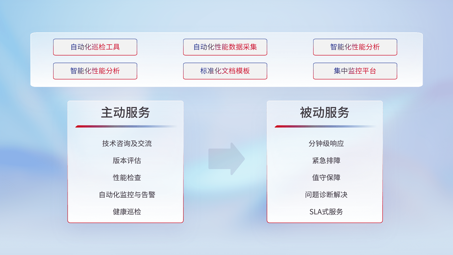 智能化工具和标准化文档,,,,保障服务质量,,,提供主动服务(包含技术咨询、、版本评估、、、、性能检查、、自动化监控与告警、、、、健康巡检)和被动服务包含(分钟级响应、、、、紧急排障、、、值守保障、、问题诊断解决、、SLA服务)。。。。