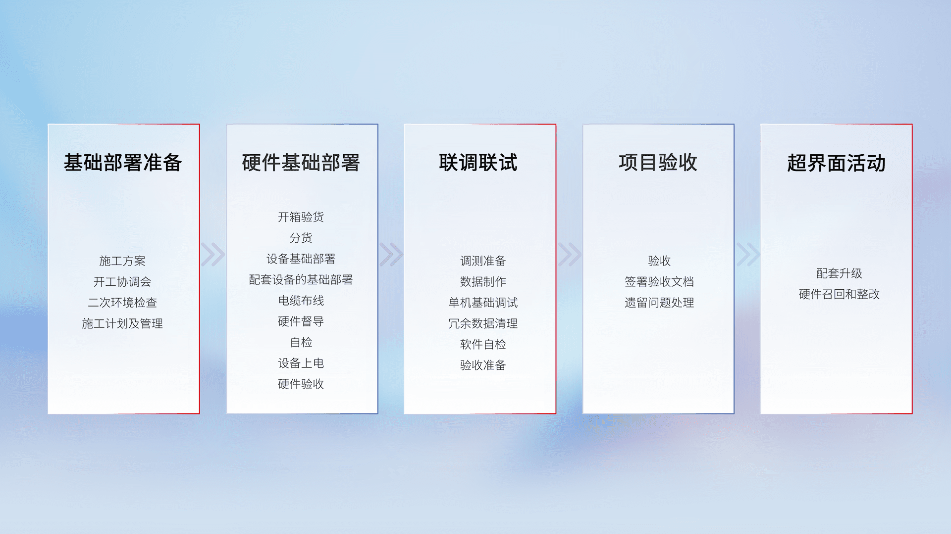 从基础部署准备、、硬件基础部署、、、、联调联试、、、项目验收、、、越界面活动的全过程可追溯,,,,保证施工质量和进度。。。。